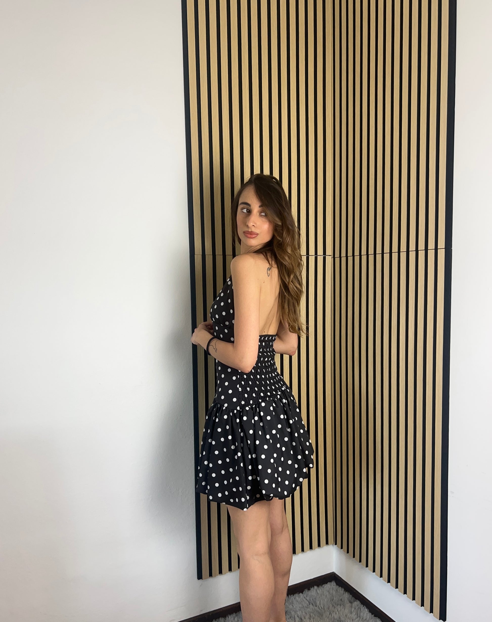L'abito a pois nero è perfetto per un look casual ma elegante. Il design a balze dona movimento e la lunghezza corta lo rende versatile per ogni occasione. Aggiungi un tocco di stile ai tuoi outfit con questo abito pois!