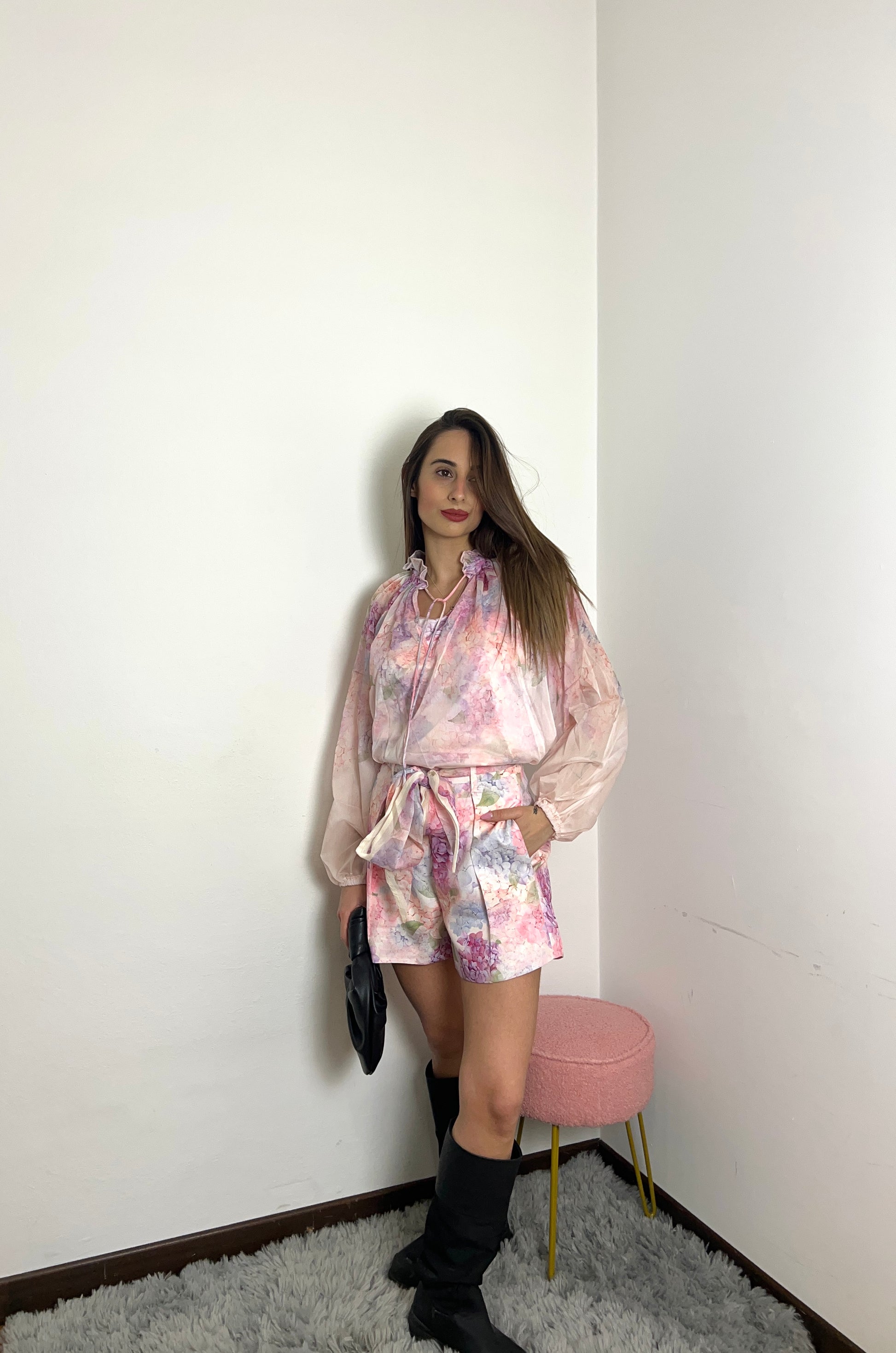 Crea un look primaverile super colorato con il coordinato flower. Il pantaloncino a vita alta e la blusa abbinata ti faranno sentire fresca e alla moda. Aggiungi un tocco di allegria al tuo guardaroba con questo coordinato unico!