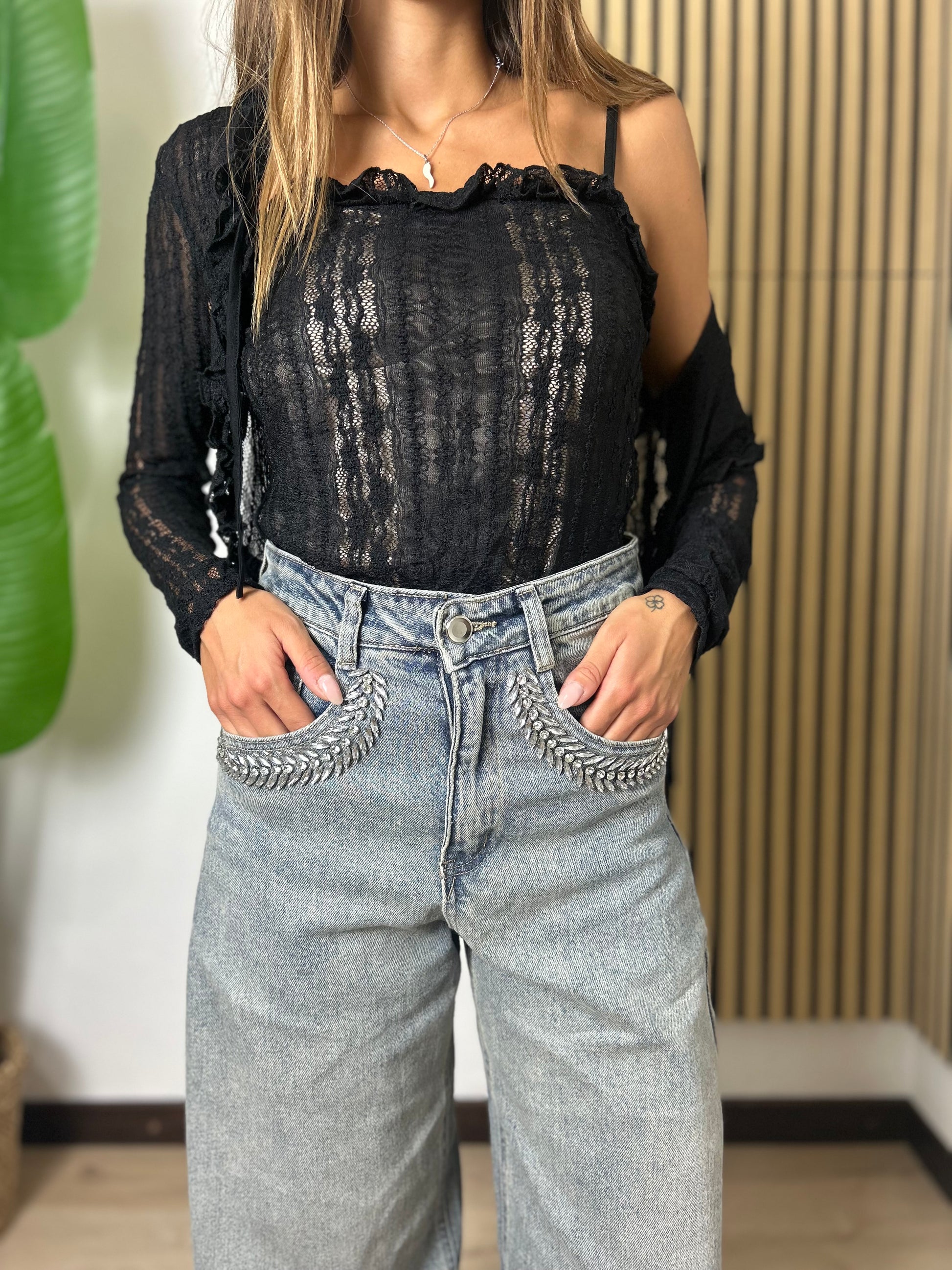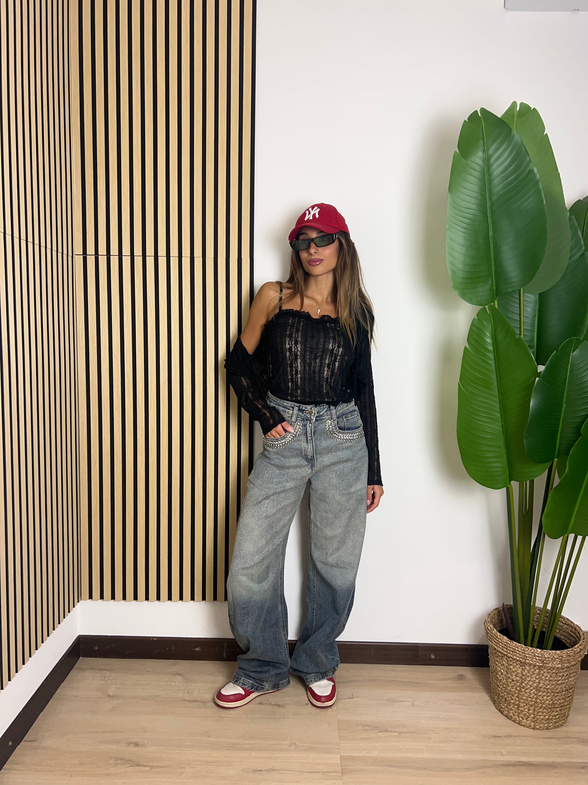 "Goditi il comfort e lo stile con i nostri nuovi jeans cally! Il modello loose è comodo e confortevole, mentre la tasca con strass luccicanti aggiunge un tocco di eleganza. Aggiorna il tuo guardaroba con questi jeans unici."