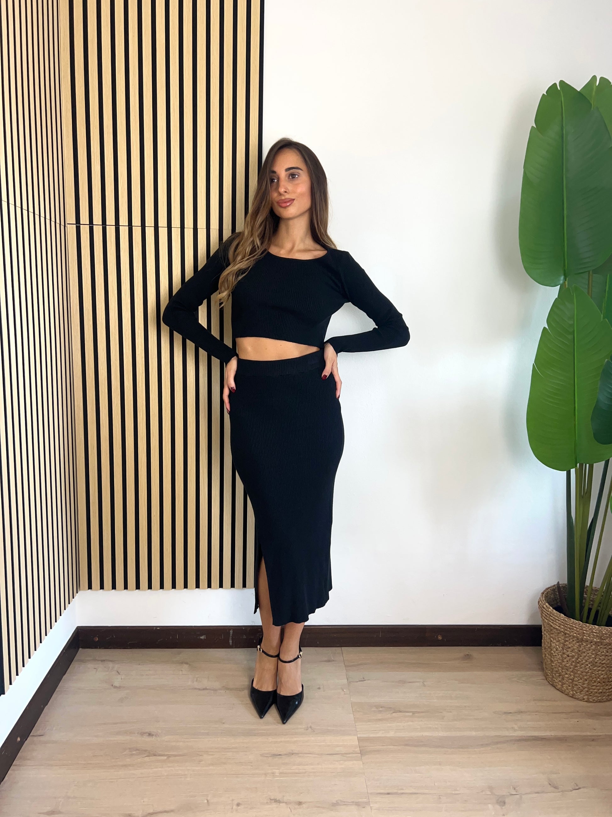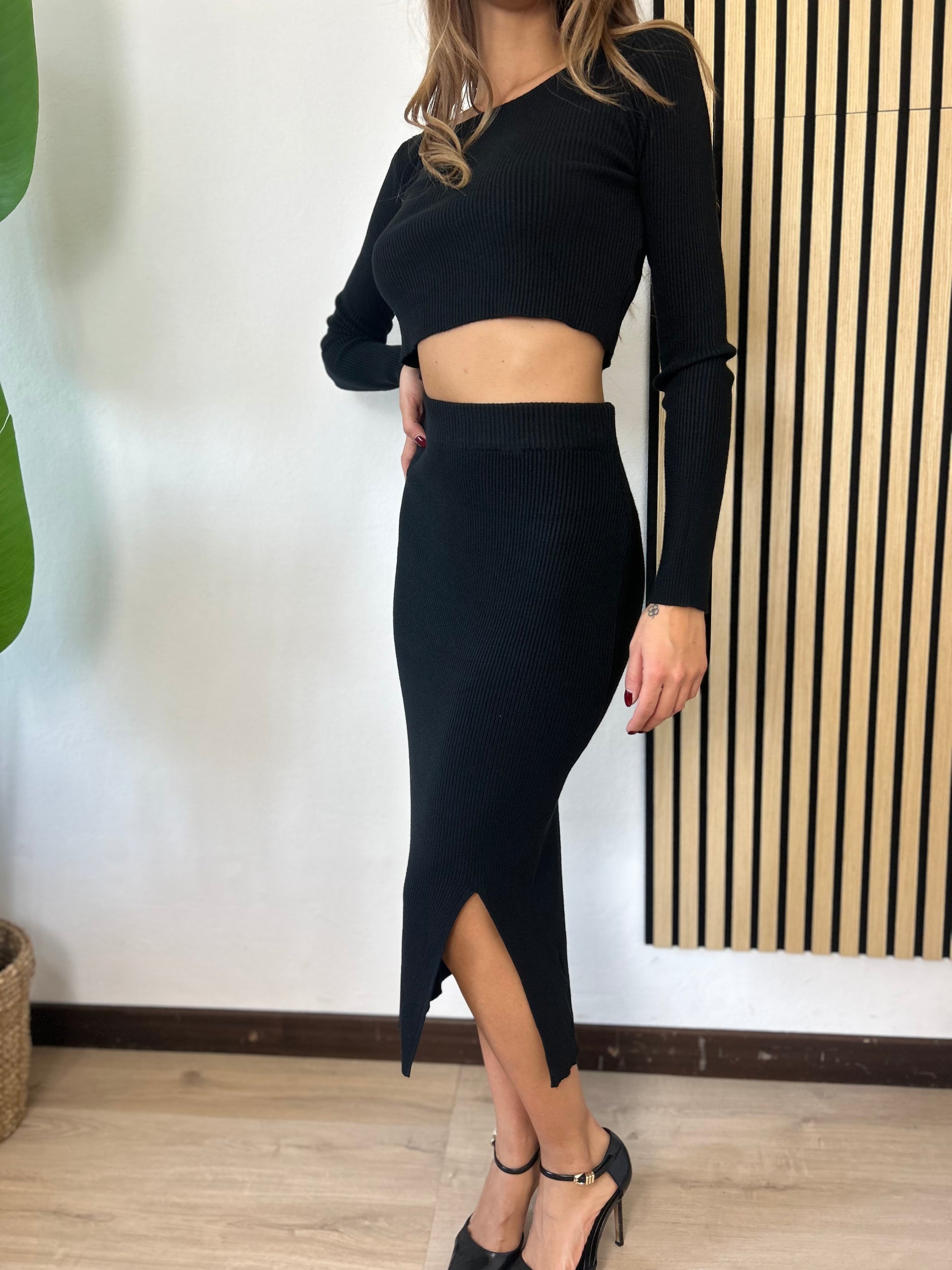 Il set anastasia offre un look dinamico e versatile grazie alla gonna con piccolo spacco sulla gamba sinistra e alla maglia crop a manica lunga. Il tessuto in morbida maglia rende il set comodo e adattabile a diverse taglie. Semplice e moderno per ogni occasione.