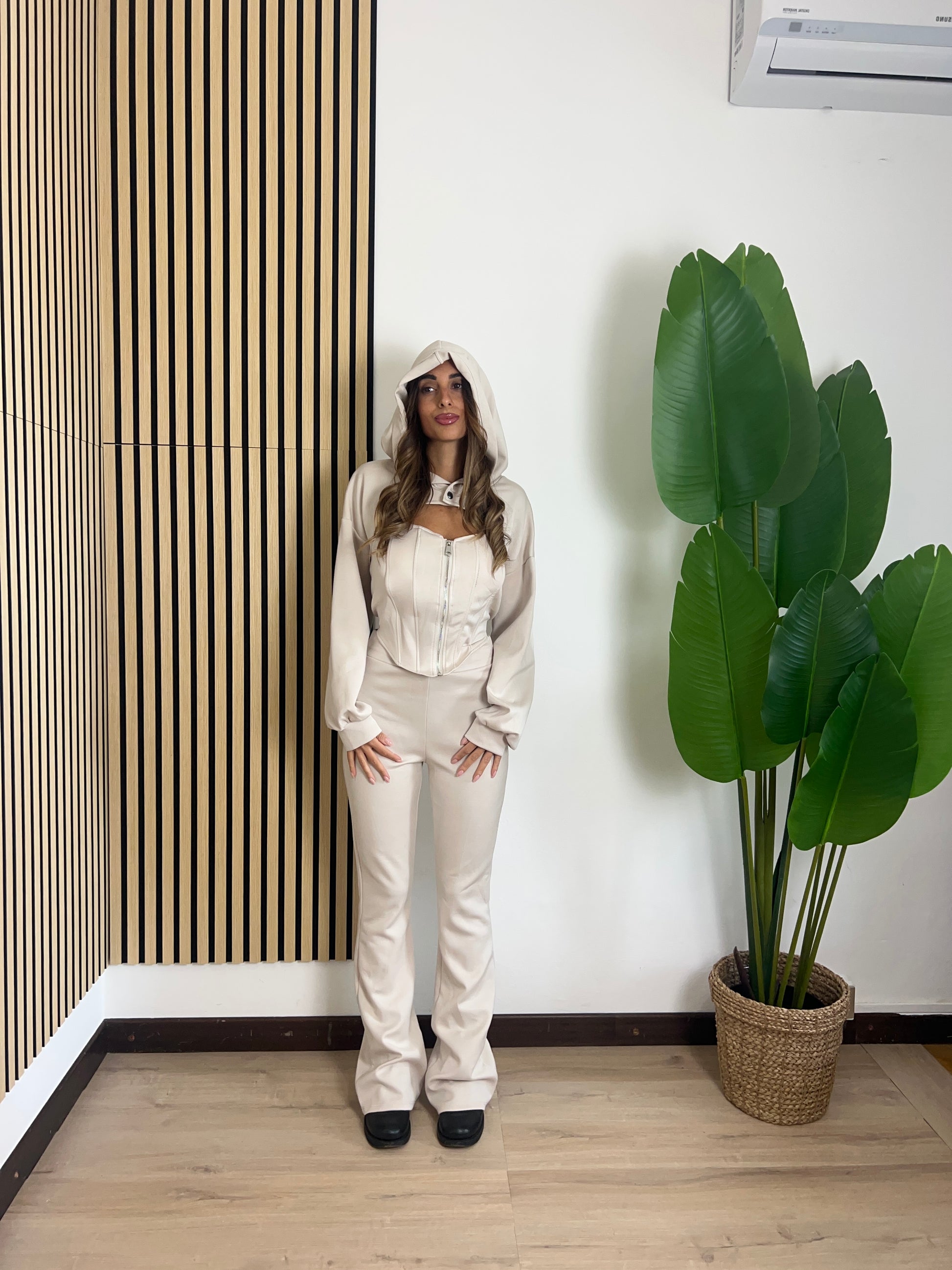 Con il Set Clotilde, composto da tre pezzi, il comfort è garantito! Il pantalone elasticizzato ha una leggera zampa ed è dotato di corsetto con zip e coppe interne. La felpa crop con cappuccio e bottoncino aggiunge uno stile unico al tuo outfit. È taglia unica,veste da una xs a...