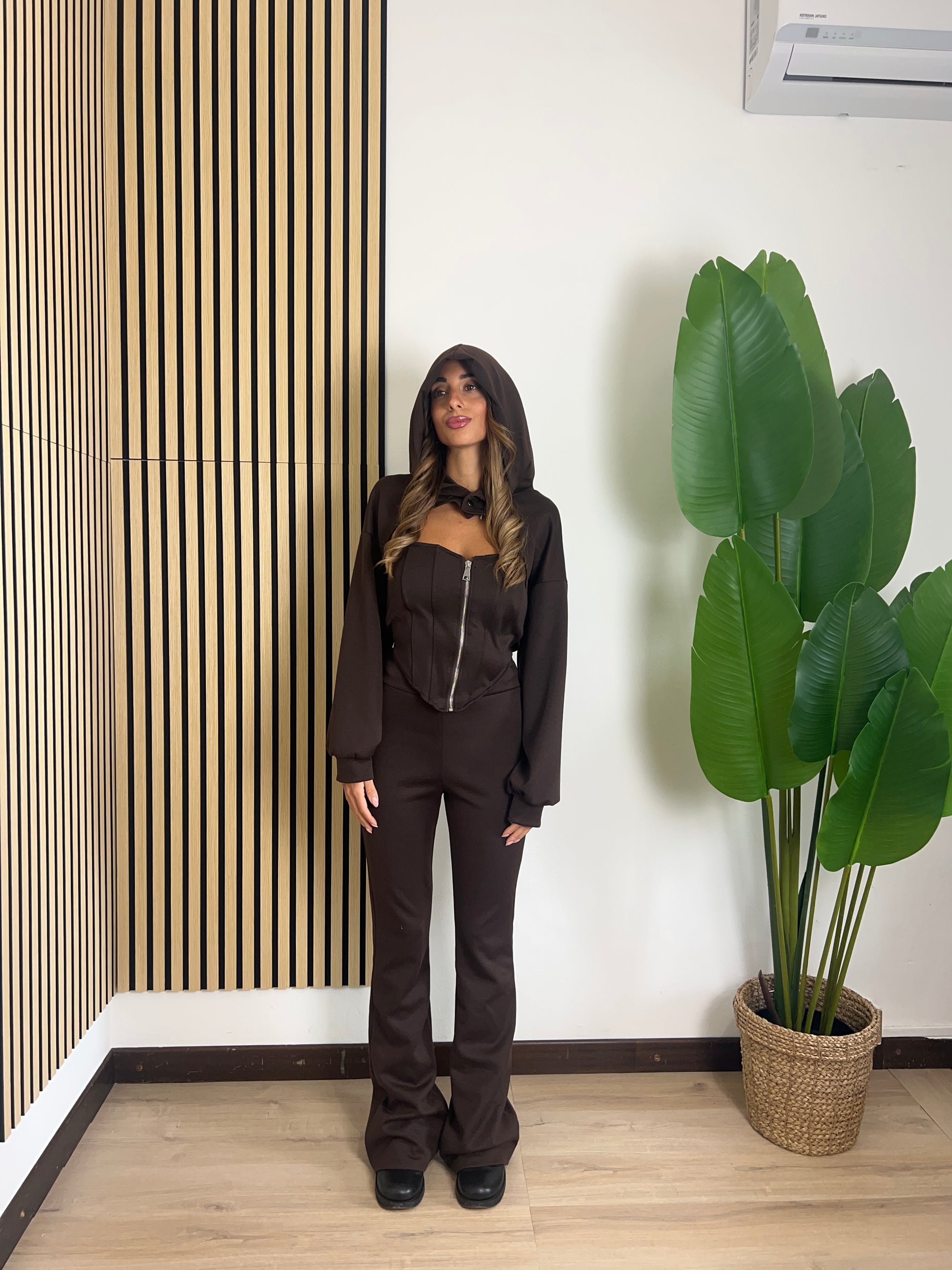 Con il Set Clotilde, composto da tre pezzi, il comfort è garantito! Il pantalone elasticizzato ha una leggera zampa ed è dotato di corsetto con zip e coppe interne. La felpa crop con cappuccio e bottoncino aggiunge uno stile unico al tuo outfit. È taglia unica,veste da una xs a...