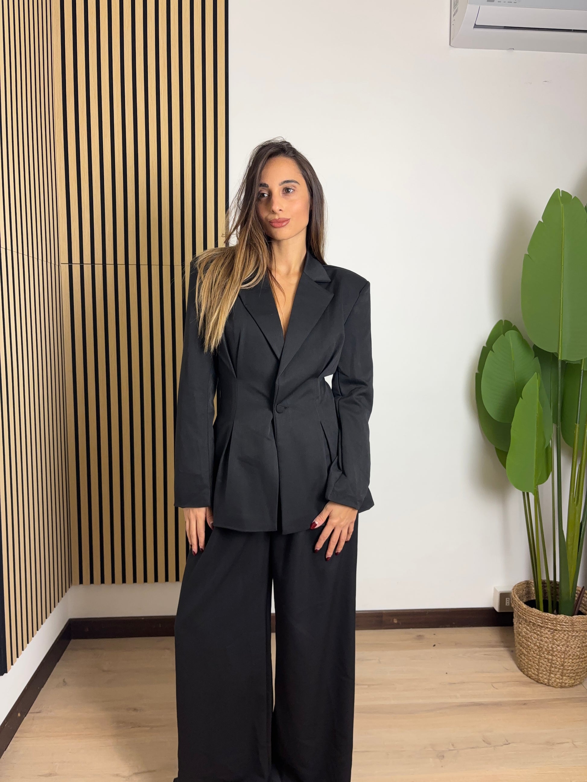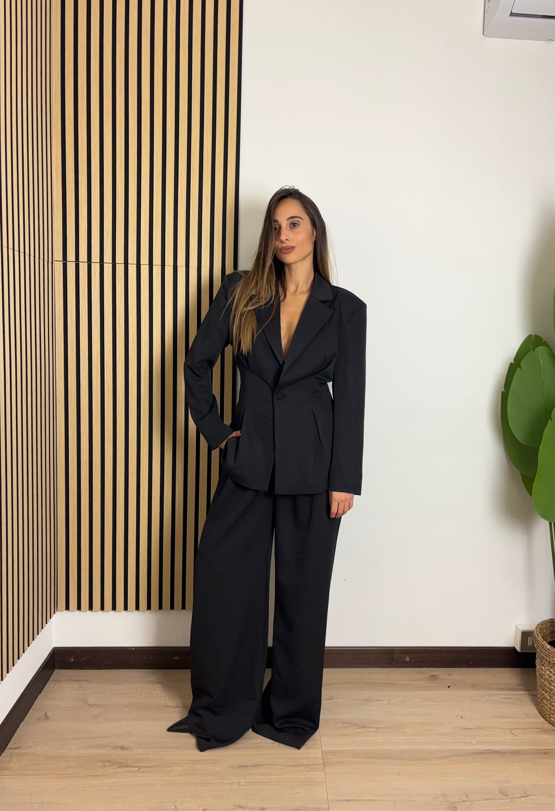 Set composto da pantalone a palazzo e blazer con bottone centrale.